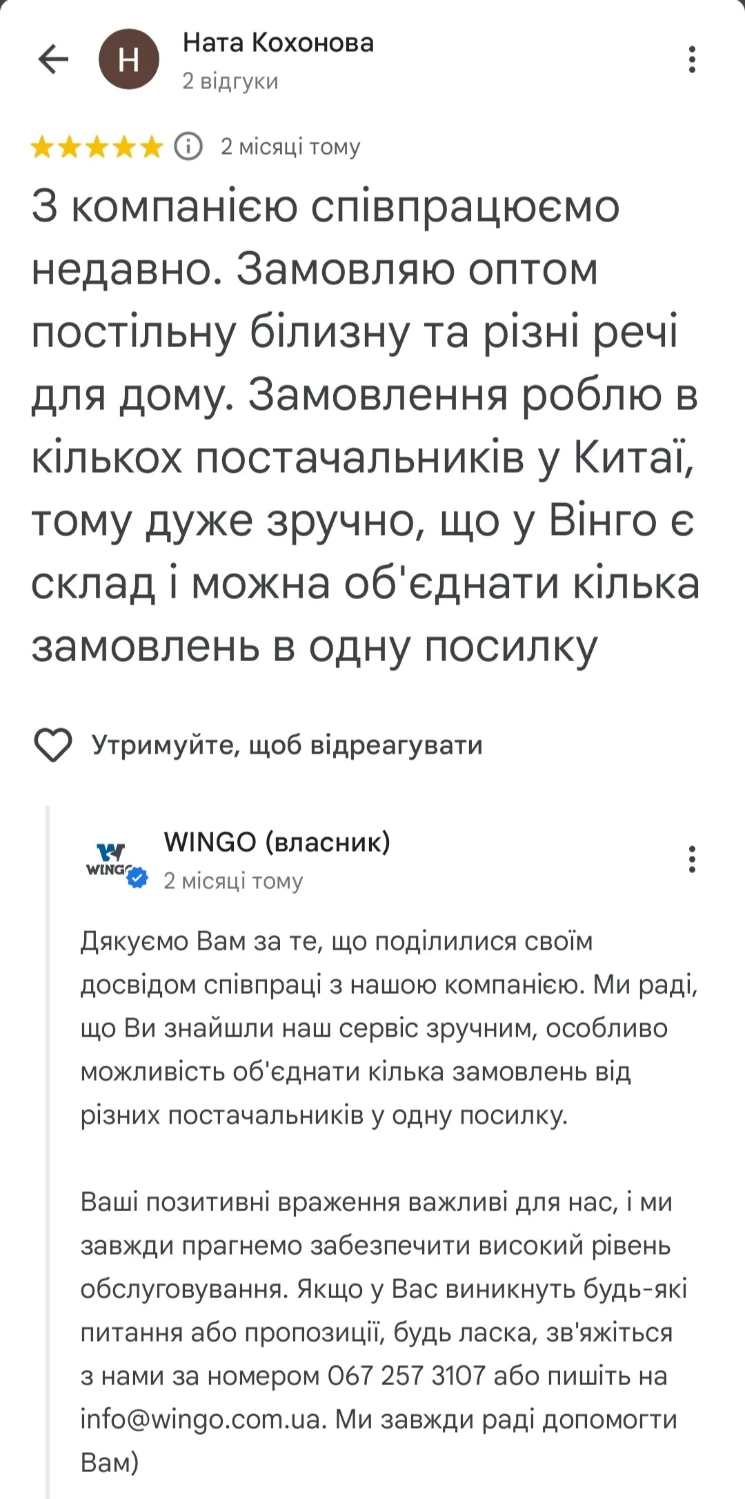На протяжении нашего сотрудничества я не раз пользовался другими видами доставки от Wingo и всегда оставался доволен. Они предлагают широкий выбор вариантов доставки, что очень удобно в зависимости от потребностей и срочности заказов.
