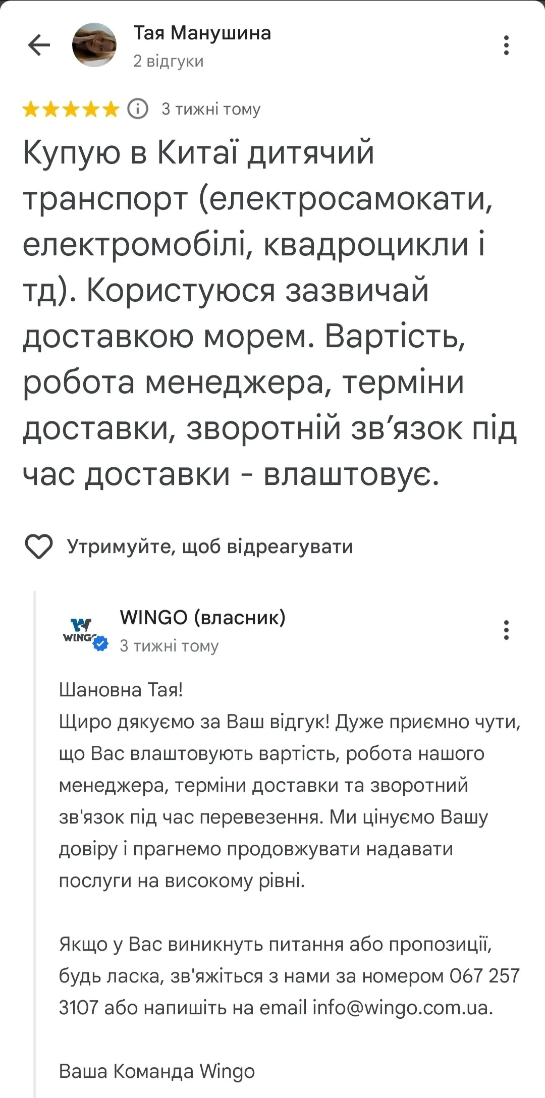 Я обязательно воспользуюсь услугами Wingo снова и рекомендую их сервисы всем, кто нуждается в надежном партнере для доставки грузов. Спасибо, Wingo, за отличный сервис и поддержку!